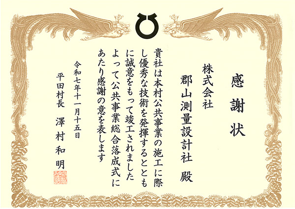 | 2017年10月 | 福島県測量設計業協会様 感謝状 |