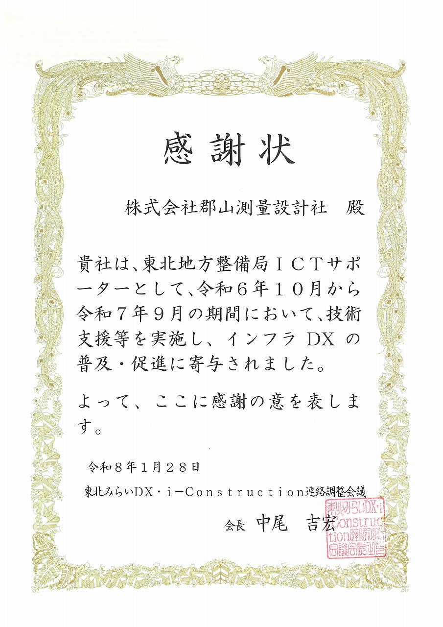 東北みらいDX・i-Construction連絡調整会議会長様より、感謝状を授与しました。